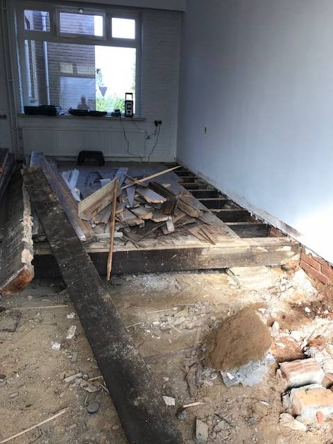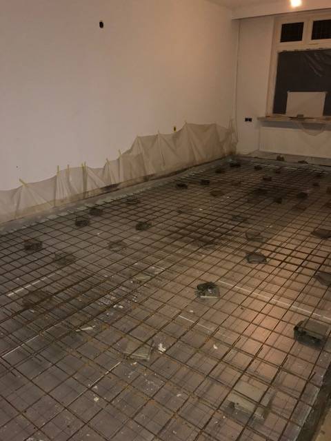 Gekozen is voor het volledig verwijderen van alle rotte en beschadigde delen en de bestaande situatie te vervangen voor een gestorte betonvloer. Tevens is de ondervloer geïsoleerd. De betonvloer is nadien afgewerkt met een gietdekvloer.